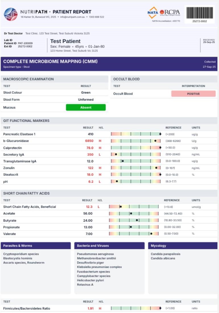 A Complete Microbiome Mapping test (valued at $426). This gives us a detailed analysis of your markers of digestion, inflammation and gut function, to help identify imbalances that may be contributing to symptoms. It also identifies levels of good and bad bacteria, parasites, fungi and worms.
